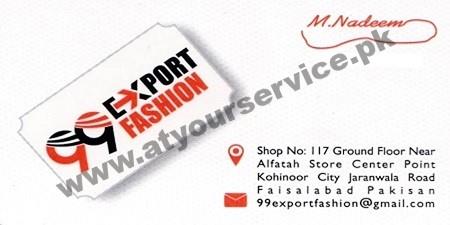 99 Export Fashion is located in Center Point, Jaranwala Road, Kohinoor City, Faisalabad. It deals in gents casual wear.