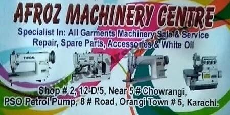 Afroz Machinery Centre is located in Chowrangi No. 5, Road No. 8, Orangi Town No. 5, Karachi. We are the specialist in providing sales and service support for all kind of garments machinery including parts and accessories.