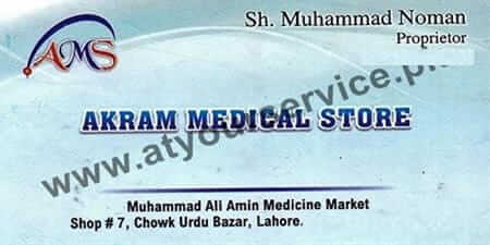 Akram Medical Store is located in Muhammad Ali Amin Medicine Market, Urdu Bazar, Lahore.