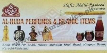 Al Huda Perfumes & Islamic Items are located on Nawab Mohabat Khanji Road, Khajoor Bazar, Karachi.