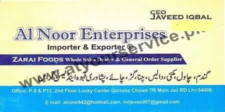 Al Noor Enterprises is located in Lucky Centre, Qurtaba Chowk, Jail Road, Lahore. We deal with a large variety of agricultural food products such as wheat, rice, maize, corn, pulses, gur, tea, Peshawari kahwa (Peshawari Green Tea), lemon grass, etc.