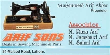 Arif Sons is located in McLeod Road, Lahore. We deal with all kind of sewing machines and parts.