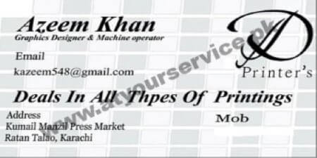 Azeem Khan Graphic Designer & Machine Operator is located in Kumail Manzil, Press Market, Ratan Talao, Karachi.
