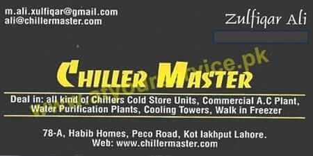 Chiller Master is located in Habib Homes, Peco Road, Kot Lakhpat, Lahore. It deals in all kind of chiller cold store units, commercial ac plants, water purification plants, cooling towers, walk in freezer