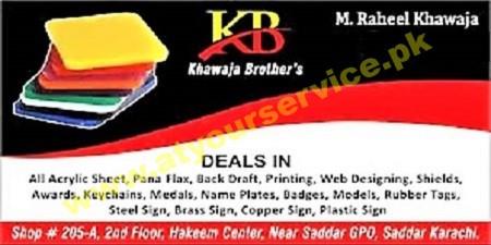 Khawaja Brothers are located in Hakeem Centre, Saddar, Karachi. We deal with all kind of acrylic sheets, panaflex, backdrop, printing, web designing, shields, awards, keychains, medals, nameplates, badges, medals, rubber tags, street sign, brass sign, copper sign, plastic sign, etc.