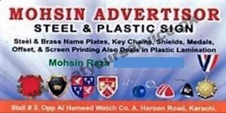Mohsin Advertiser, Steel & Plastic Sign is located on Abdullah Haroon Road, Saddar, Karachi. We deal with steel & brass nameplates, key chains, shields, medals, offset & screen printing, plastic lamination and more.
