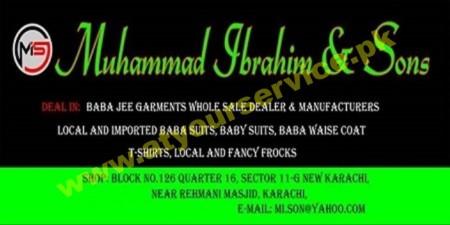 Muhammad Ibrahim & Sons is located in Quarter 16, Sector 11G, New Karachi. We deals in Baba Jee Garments, Baba Suits, Baby Suits, Baba Waist Coat, T-Shirt, Fancy Frock. All items in local and imported quality are available at whole sale and retail rates.