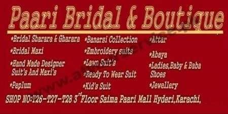 Paari Bridal & Boutique is located in Saima Paari Mall, Hyderi, Karachi.