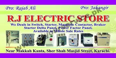 R J Electric Store is located in Masjid Street, Sher Shah, Karachi. It deals in switches, starters, magnetic connectors, breakers, starter delta panel, power factor panel.