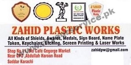 Zahid Plastic Works is located on Abdullah Haroon Road, Saddar, Karachi. We deal with all kinds of shields, awards, medals, signboards, nameplates, tokens, keychains, etching, screen printing, laser works, etc.