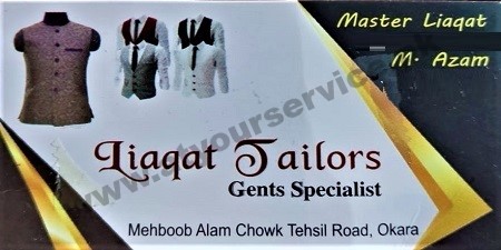 Liaqat Gents Tailors is located at Mehboob Alam Chowk, Tehsil Road, Okara...