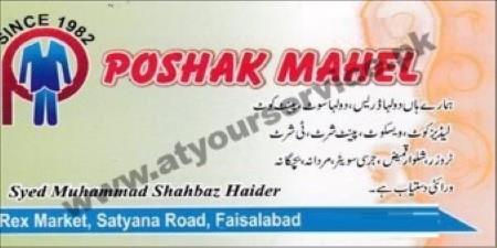 Poshak Mahal is located in Rex Market, Satyana Road, Faisalabad. We deal with all variety of d..